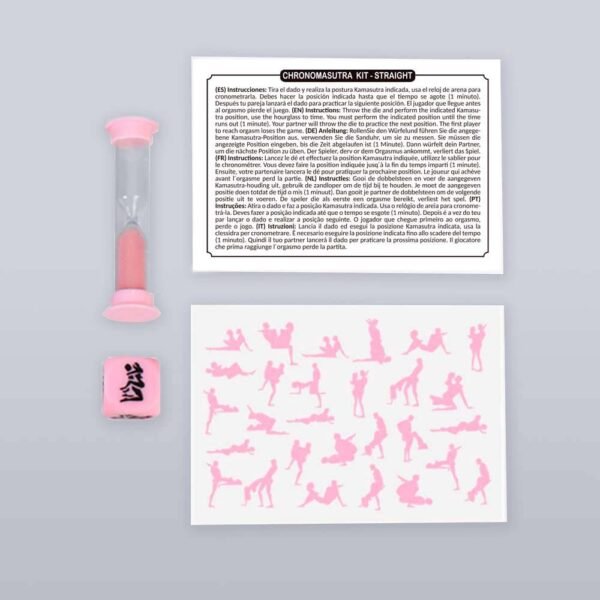 Profitez des positions du Kamasutra au moment parfait!Lancez le dé et effectuez la position Kamasutra indiquée, en utilisant le sablier pour vous chronométrer. Vous devez exécuter la position indiquée jusqu’à ce que le temps s´écoule (1 minute). Ensuite votre partenaire lancera le dé pour pratiquer la position suivante. Le premier joueur à atteindre l’orgasme perd la partie.Contenu:1 sablier (1 minute)1 dé positions Kamasutra (2,5 cm)